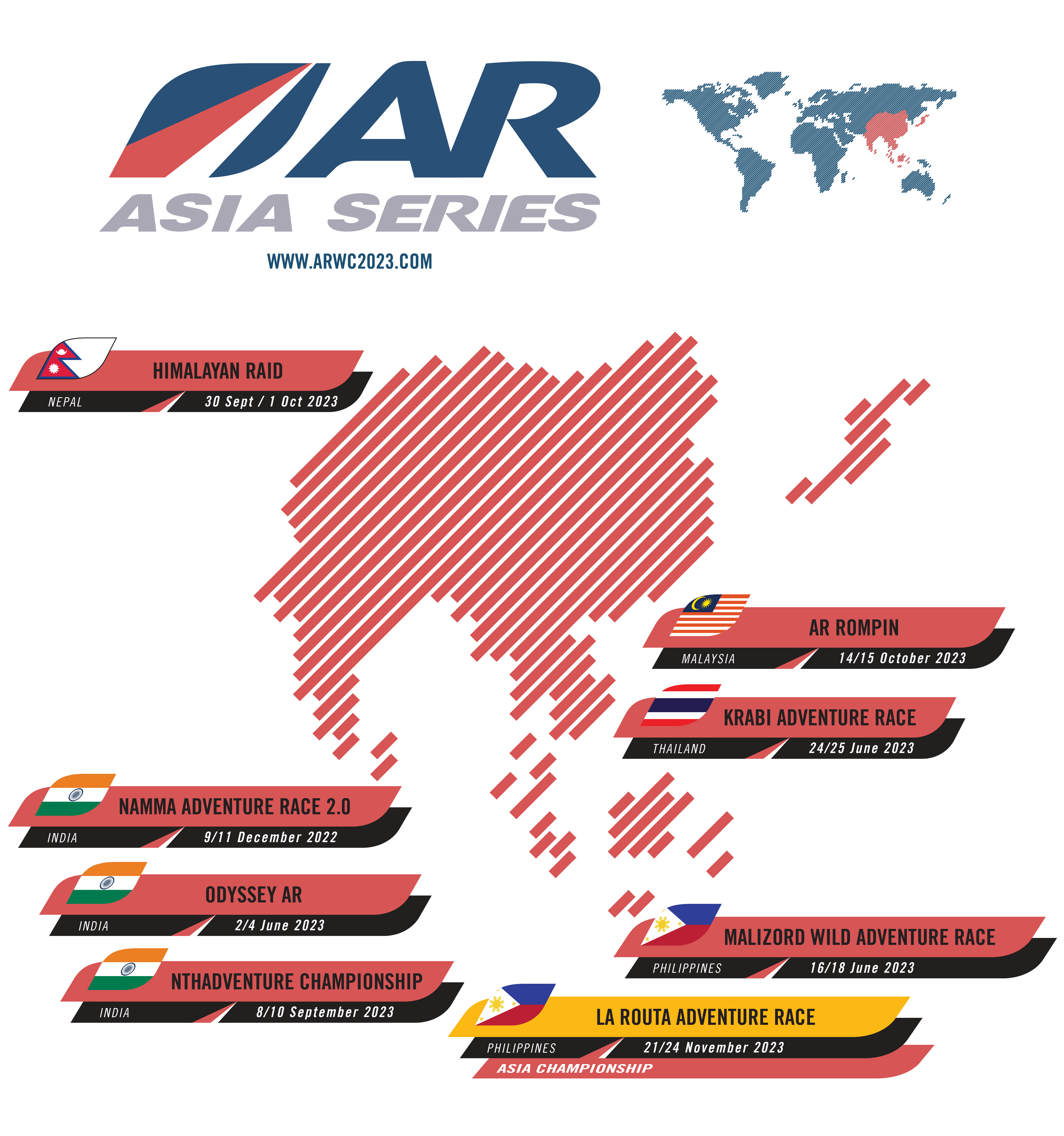 Event organisers set unique courses to test athletes over 125-250km of non-stop day and night racing in the disciplines of trekking, mountain biking, kayaking, and navigation. Participating teams earn points towards their Asia Ranking and the winner of each round gains entry to the ARWS Asia Championship. In 2025 the championship race will be hosted by La Routa Adventure Race in the Philippines in November.