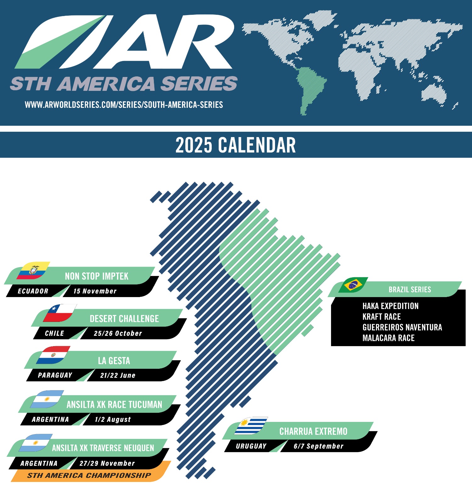 2025 series races take place in Paraguay, Chile, Argentina, Uruguay and Ecuador. (There is also an ARWS Brazil Series of 4 races.) The winning teams at each series race get a free place at the Ansilta XK Traverse race in Neuquén, Argentina, which hosts the 2025 Regional Championship.